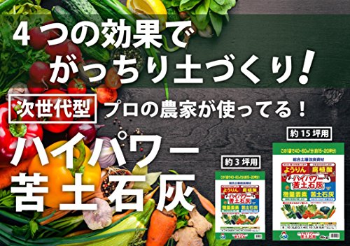 苦土石灰を肥料として使用する場合はカルシウムとマグネシウムがゆっくりと溶け出します。酸性土壌のph調整剤として混ぜる場合は、有機石灰(アルカリ分40~45%)と比べてアルカリ分が53%以上と高いため比較的早く効き、消石灰(60%以上)や生石灰(80%)と比べると緩やかに中和される使いやすいアルカリ度です。