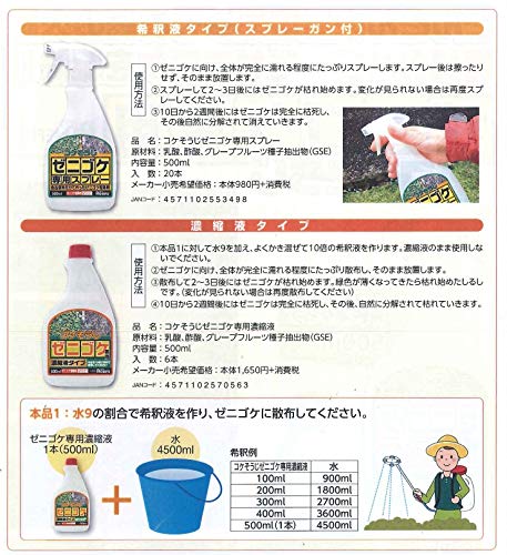 コケそうじのゼニゴケに特化した駆除剤です。通常のコケそうじに、乳酸と酢酸を加えられています。濃縮液なので水と薬液を9:1の割合で薄めて使用します。酢が入っているので、ほかの植物を枯らしてしまう可能性があり、庭などで散布する場合は注意が必要です。