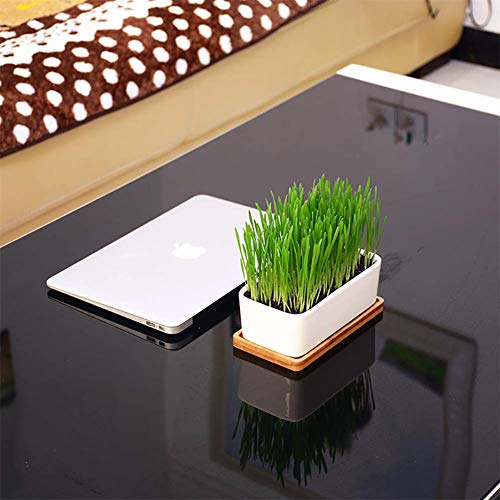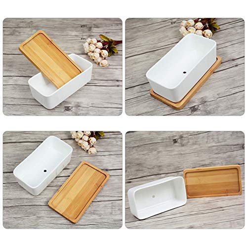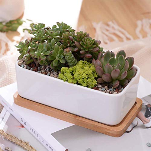 2ピースセラミック植木鉢、装飾的なミニ白長方形プランターサボテン植木鉢、竹トレイ付き、ホーム屋内オフィスガーデンに最適