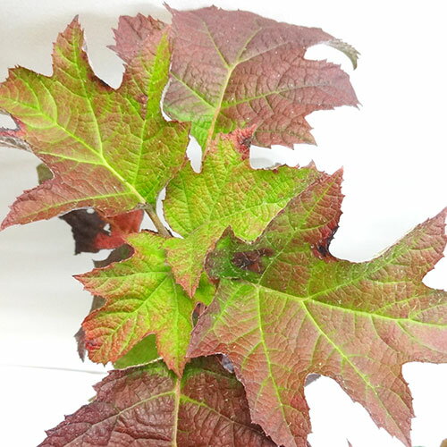 カシワバアジサイの名前は、カシワに似た葉を茂らせることが由来です。葉色は明るい緑色から暗めの緑色までさまざまあり、葉裏は白い毛でおおわれています。また、秋には葉が紅葉するのも特徴です。赤銅色や紫がかった赤色は、秋の庭を美しく彩ります。花だけでなく、葉の観賞価値も高いことで知られています。