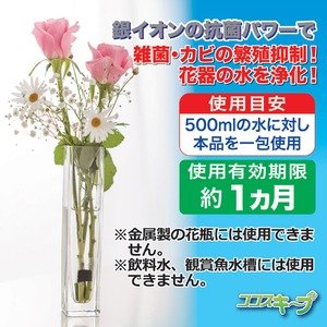 花瓶の中にバクテリアを発生させない銀成分を加えているため、花が長持ちします。ティーバッグ状の袋を花瓶に入れておいて、水が減っても水だけ足すとそのまま使えます。薬剤を薄めたり、新しく作ったりする面倒のない製品です。銀成分が比較的強めなので、金属製の花瓶は腐食してしまい、おすすめできません。