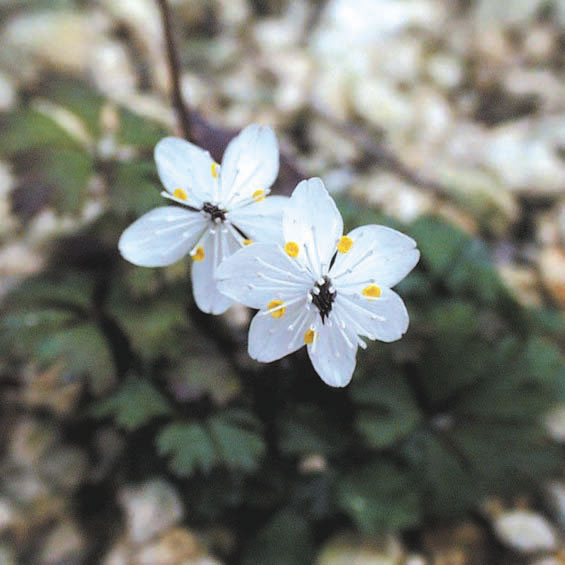 山間部に自生する「バイカオウレン」は地面にグリーンのカバーをかけたように広がります。白い花が可愛らしいですね。