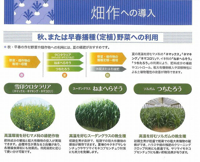 - 栽培適期:5〜7月播種→60日後にすき込み(生育が速い)