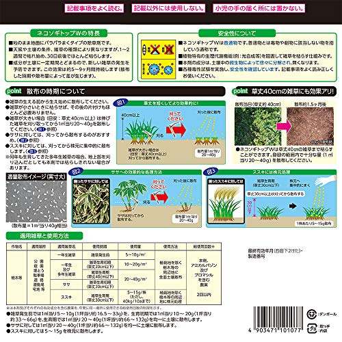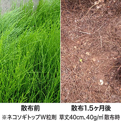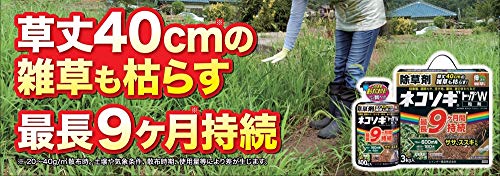 ネコソギトップW粒剤は効果までは少し時間がかかりますが、3箱ぐらい散布すれば約9カ月間の持続効果が見込める除草剤です。雑草が生える前や、草丈が40cm以内の草に散布します。