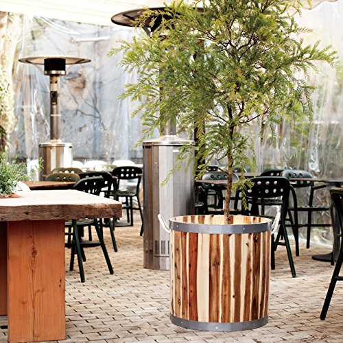 この特大・深型のプランターは、焼杉の落ち着いた色合いが美しく、樽のようなデザインになっています。植物のナチュラルな雰囲気と植木鉢の重厚感の相性が抜群です。底には排水の穴が開いており、移動させやすい持ち手も付いているので、大型サイズながら扱いやすいのもうれしいポイントですね。
