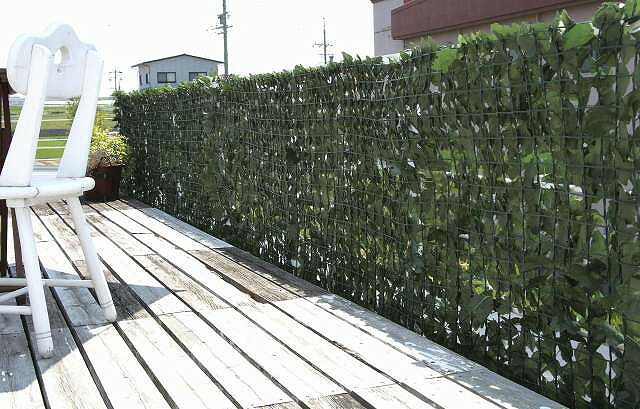 アイビーなどのフェイクグリーンを既存のメッシュフェンスやベランダの手すりにつける方法も、かんたんにできるもののひとつです。生垣はメンテナンスが大変だけど、これなら簡単。日よけの効果もあります。