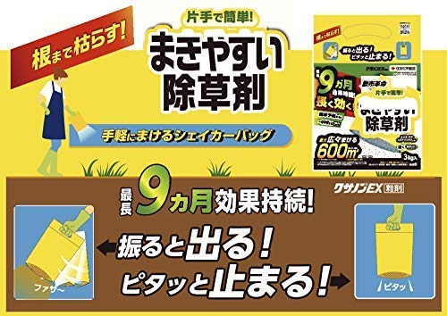 クサノンEX(3kg)のパッケージは「シェイカーバック」と呼ばれ、バックの底に散布用の穴が開いています。バックは持ちやすく、振るだけで除草剤が散布される手軽さが魅力です。