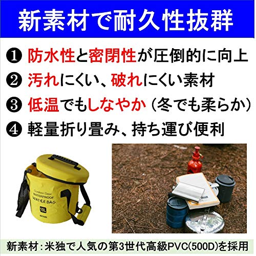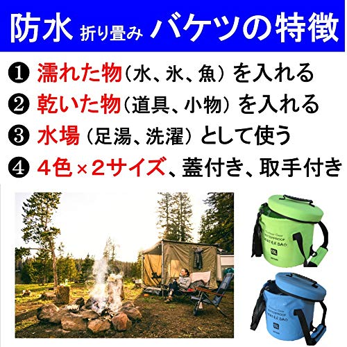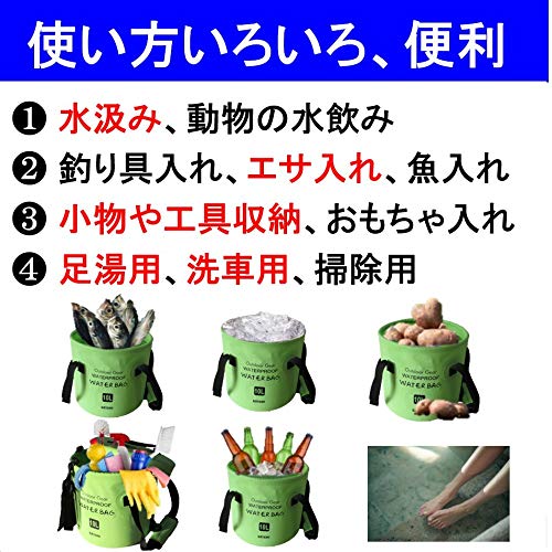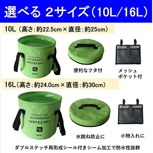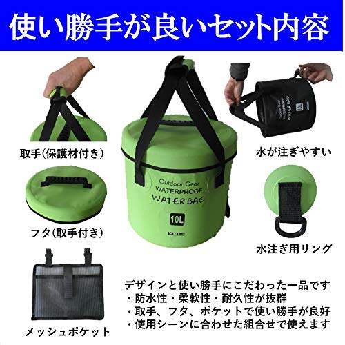 Lamore [新素材] 折りたたみ バケツ [寒い冬でも柔らか素材] 10L 16L バッカン + フタ + サイドポケット < 水汲み 釣り 洗車 足湯 > 防水バッグ アウトドア キャンプ 2年保証 [322] (1) グリーン 緑, 10L)