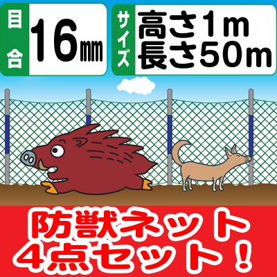 防獣ネットセットはイタチや猪、鹿などに対応しており、大きな畑を守るには最適のセットです。防獣ネットは約50mとたっぷりあり、ネットを支える杭や網の足下を固定するUピン杭、ハウスパッカーいう杭と網をとめる部品などがセットになっています。約12m四方の畑を囲める、初めてでも安心のセットです。