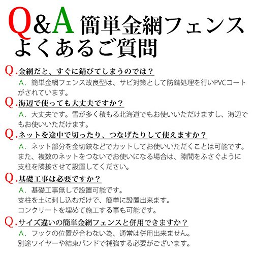 1mあたり約1,300円の価格の安さで購入できるのが簡単金網フェンスで、自分で設置できる支柱のセットと金網フェンスのみと選べます。転倒防止用のくさびもついているため、自分で設置しても安心です。金網フェンスと防獣ネットを同時に使えば、さらに強化した害獣対策ができます。