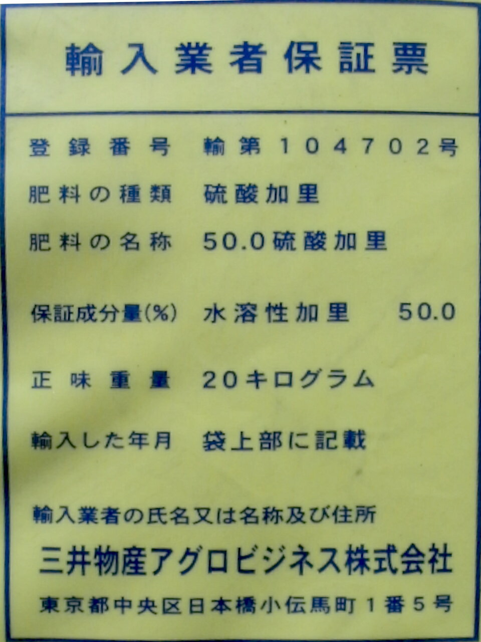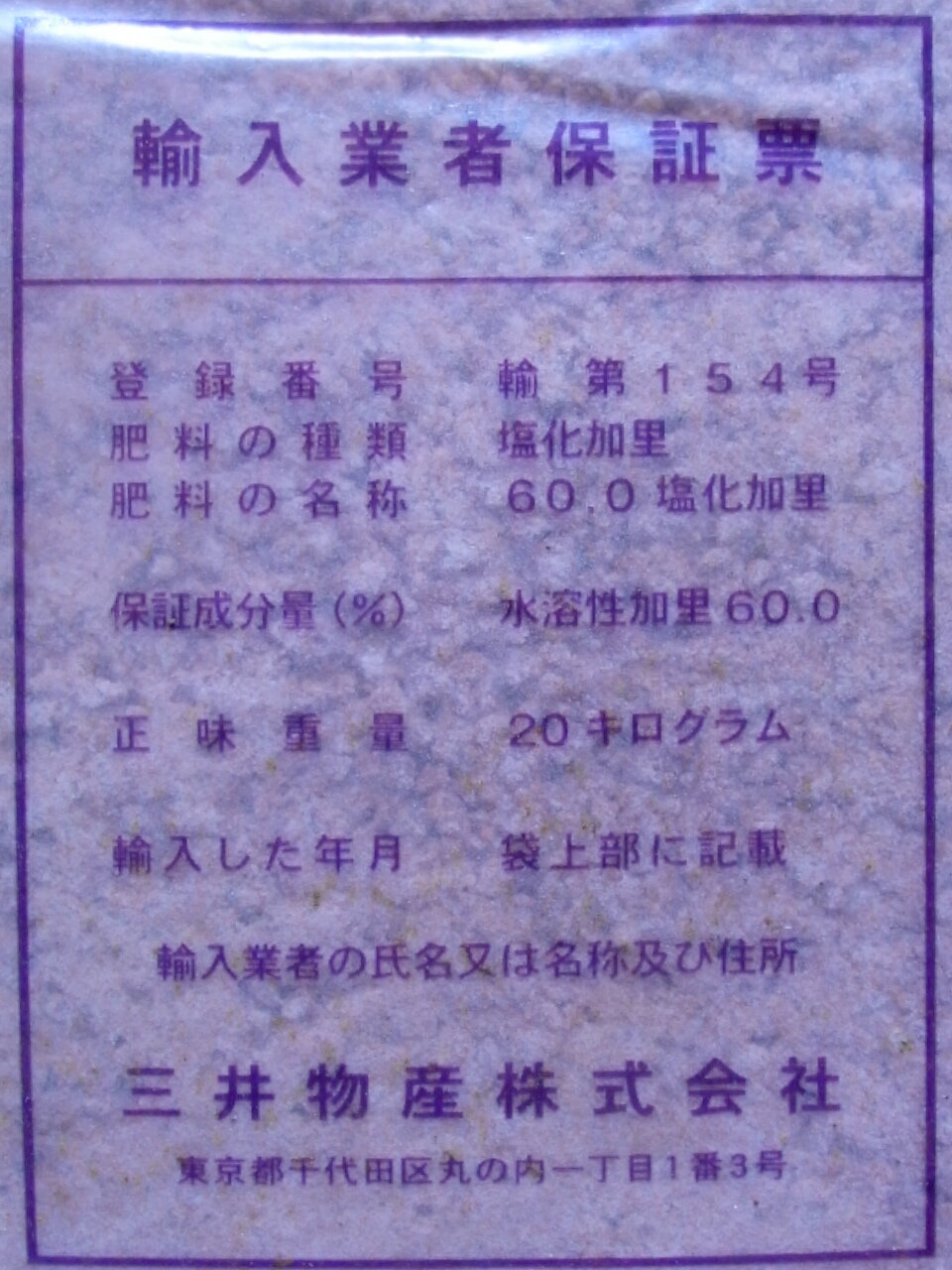 | 商品名 | 塩化カリ | 硫酸カリ | 重炭酸加里 |