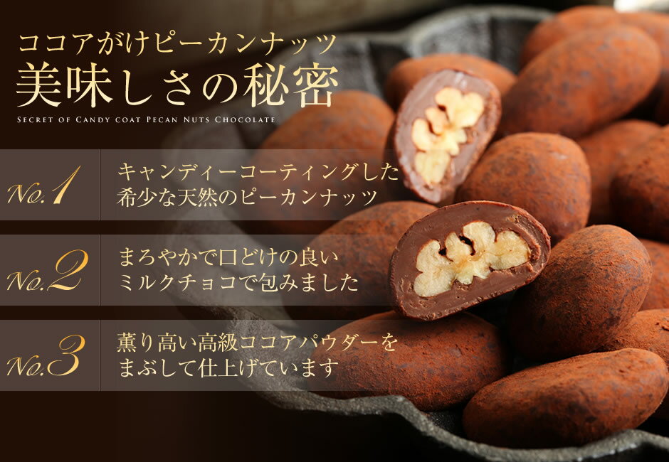 ピーカンナッツをチョコで包んだ人気商品です。小粒で食べやすいのがうれしいですね。チョコの甘さとココアのほろ苦さがアクセントととなり、ナッツ類が苦手な人にも食べやすい商品です。自分用のほか、ギフトとしてもよいですね。