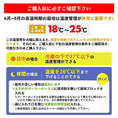 きのこを栽培する適温は10℃~25℃、肉厚なきのこに育てたい場合は13℃〜18℃で管理します。カビが発生しやすい温度は20℃~30℃のため、やや低い温度で管理してください。また、湿度を80%~92%ほどまであげてしまうと、栽培キット自体がカビの温床になります。菌床が湿りすぎている場合はふたを外して、しばらく通気しましょう。