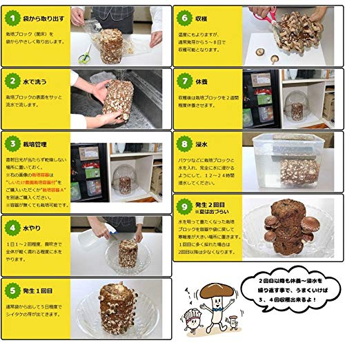 浸水させたあとは「準備③容器にセットする」に戻り、水やりや収穫などの栽培方法を繰り返します。1回目の収穫で、菌床ブロックに含まれている栄養をほぼ使用するため、2回目、3回目以降の収穫量は少なくなるのが特徴です。浸水させてから8日〜10日ほどで、新しいきのこが生えてきます。