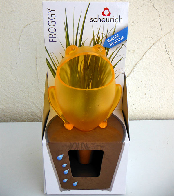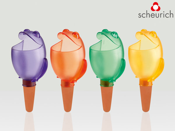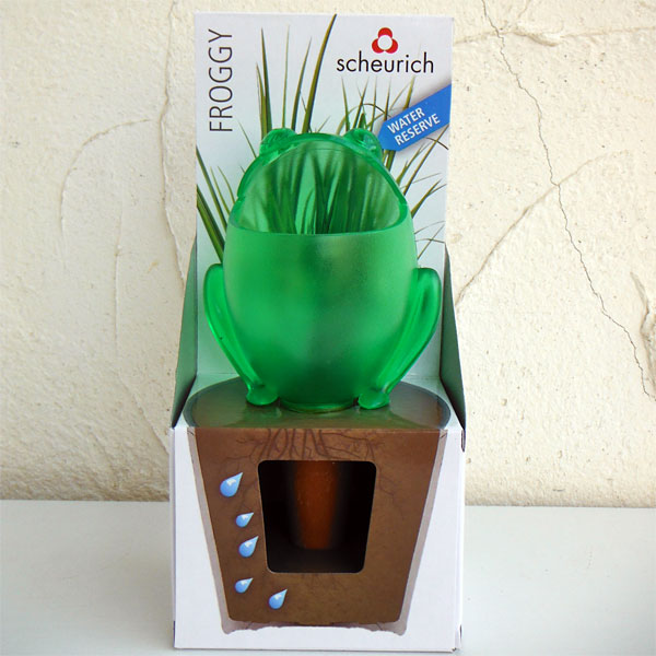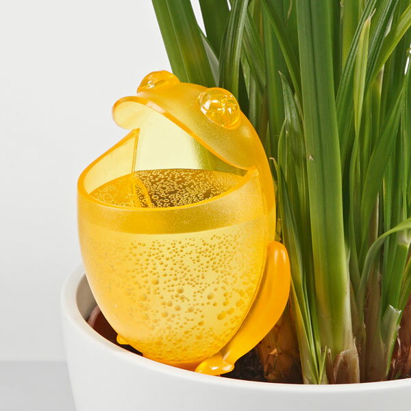 フロッギーとは、ドイツの有名ブランド「Scheurich(シューリッヒ)」社製の自動水やり機です。鉢土に挿入し水を入れておくだけで簡単に使用することができます。丸みのあるデザインやカエルの表情、色合いもクリアでかわいいのでアクセサリーとしてもおすすめです。