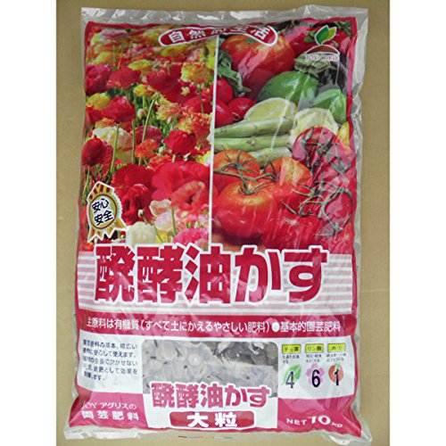 数ある種類の中で菜種油粕が一番生産量が多く、最もポピュラーです。比較的ゆっくりと効く油粕肥料のため、土壌改良や土壌中の微生物を増やす働きも大きいのが特徴です。菜種の種子を炒るときに加熱しすぎて黒くなっているものや、油分が多く残るものは分解に時間がかかり肥効が遅くなるので注意が必要です。