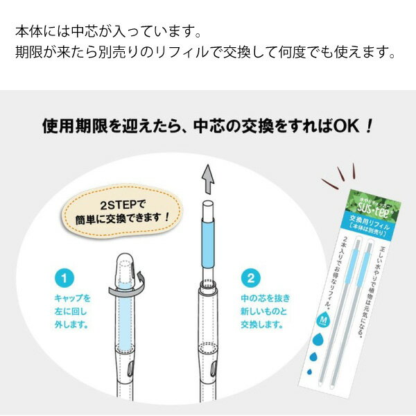 「水やりチェッカー sustee(サスティー)」は、約1年間使用できます。使い捨てではなく交換用レフィルで再度使用できるのもポイントです。