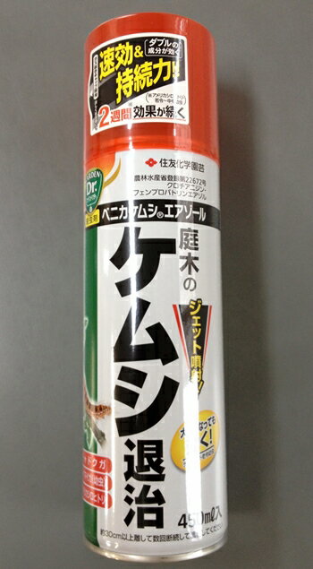 ベニカケムシエアゾールはジェット噴射式で、ハムシを見つけたときにすぐに吹きつけられて便利です。速効性だけでなく、2週間の持続性があり、散布後に発生した害虫も退治します。いろいろな庭木のケムシにも、大きく成長したチャドクガにも効果的です。