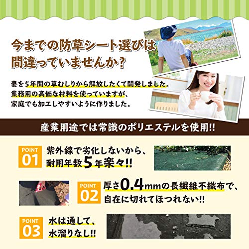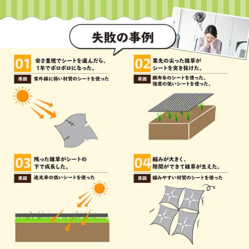 | デメリット | ・破けやすい ・隙間ができやすい ・イネ科雑草に弱い |