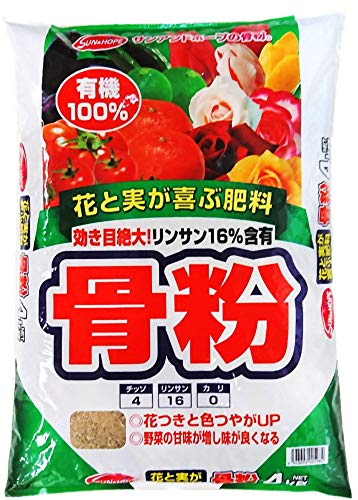 サンアンドホープの「骨粉肥料」は、有機質100%の蒸製骨粉です。葉や茎を丈夫にし、花つきや実つきをよくする効果があります。窒素4:リン酸16:カリ0と、リン酸が非常に多く含まれているのが大きな特徴です。バラなどの花木はもちろん、野菜や果樹の栽培にも向いています。ただし、この骨粉肥料にはカリウムがほとんど含まれていません。草木灰のようなカリウムを含む資材を一緒に使って補いましょう。