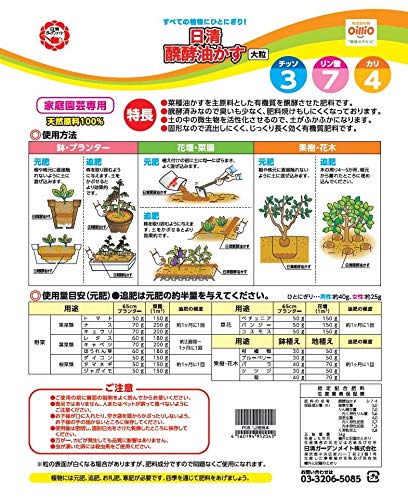 油かすは、大豆や菜種を搾ったあとに残るカスを利用した有機肥料です。未発酵タイプと発酵タイプのものがあり、未発酵のものは土の中で発酵してから効果をだすため時間はかかりますが、コストが安く農地など広い場所への施肥が適しています。発酵済みのものは効果がすぐに得られますが、ややコストが高いため庭の植木や花などの植物に使うのがおすすめです。