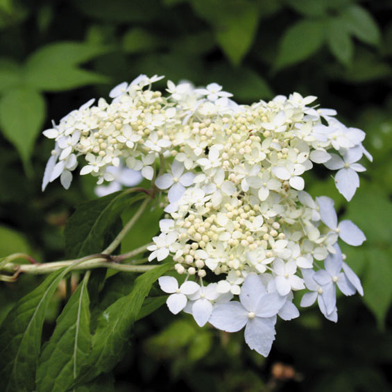 笹の舞は高知県産のヤマアジサイです。最初は緑がかった白色ですが、純白色を経て薄い青色に変化します。ヤマアジサイらしく、葉は細くて黄緑色の柔らかな風あいを帯び、てまり状の花も小さいことから、清楚でおしとやかな印象です。寺院などでもよく植栽されている人気種です。