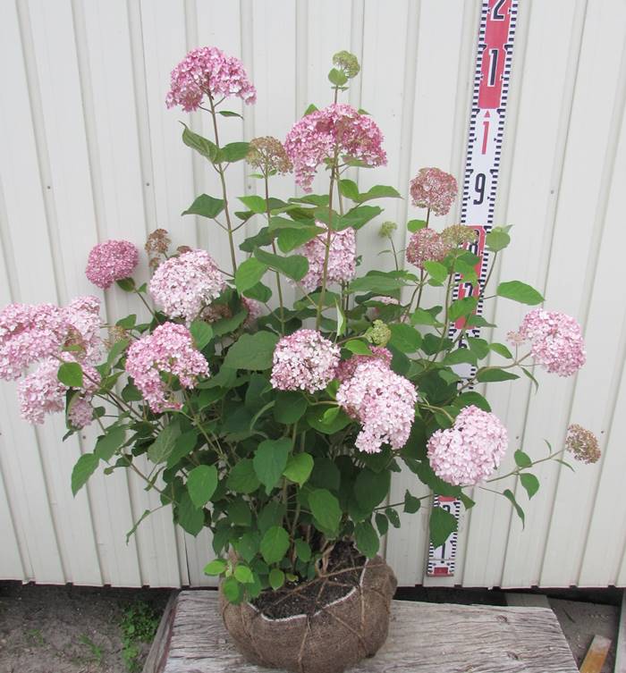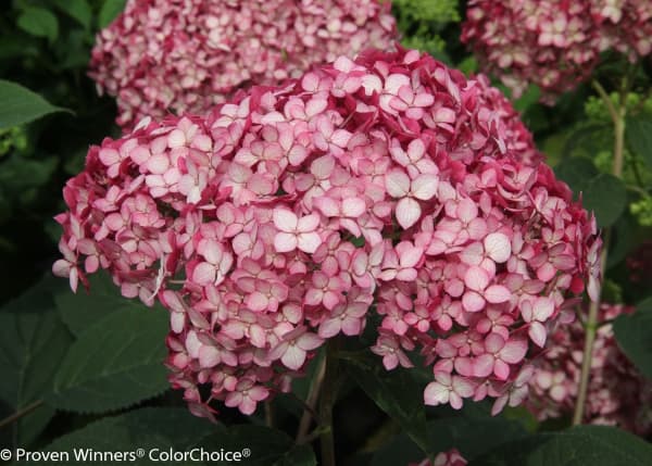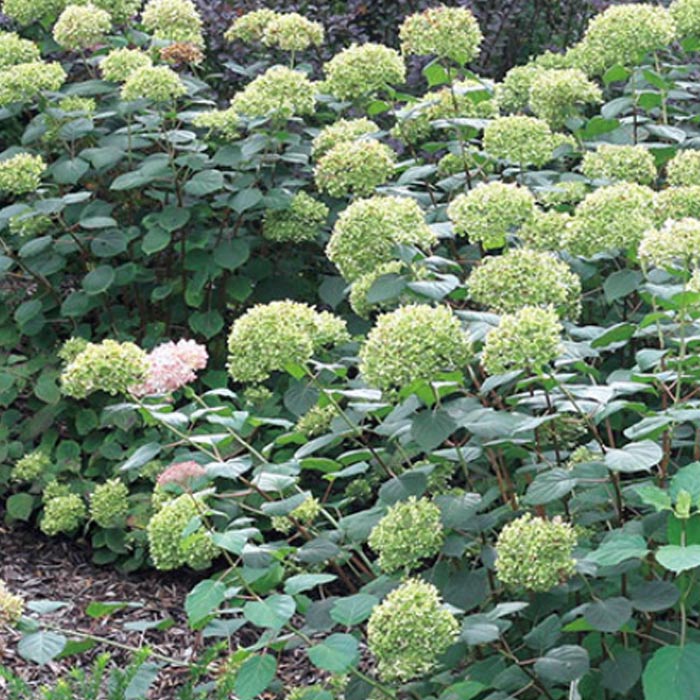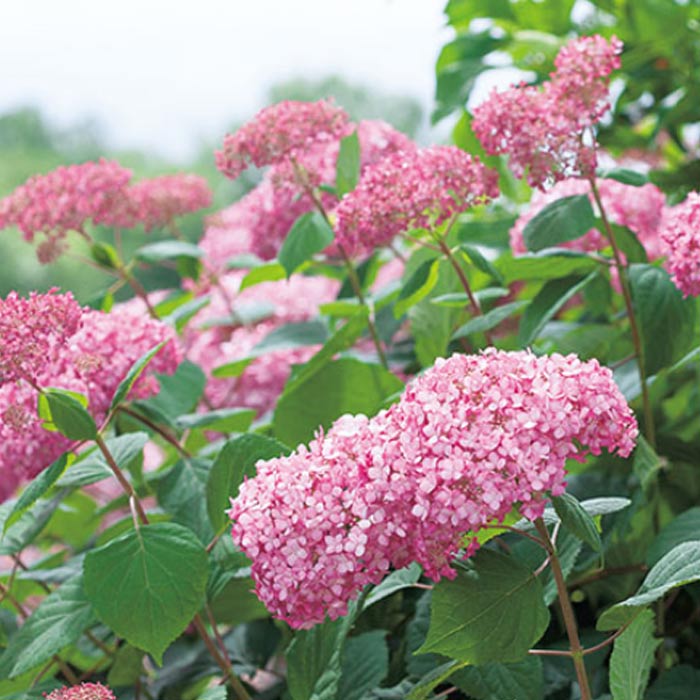 ピンクアナベル2はピンクアナベルの改良品種で、くり返し花が咲き、夏から霜が降りるころまで長期に渡り楽しめます。従来のピンクアナベルより花と葉の色がより濃い色をしており、ピンク色の花が徐々にグリーンに変化するのが特徴です。