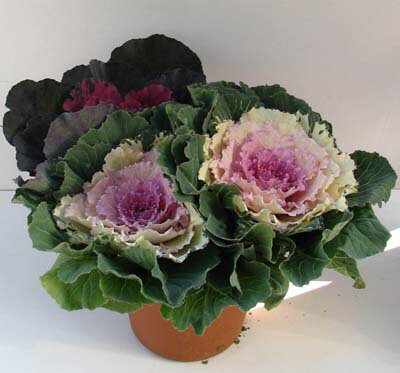 葉牡丹は、正月のプランツギャザリングにピッタリです。単色やグラデーションの入った葉など、ほかの植物とのさまざまな組み合わせが楽しめます。葉が長持ちするので、長期間作品が楽しめる、おすすめの植物です。