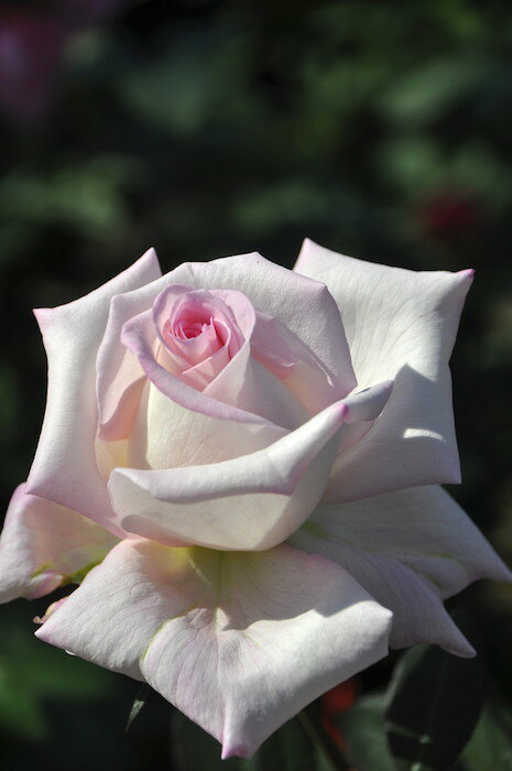 晴世は1990年、日本のバラ育種家で京成バラ園芸初代所長の鈴木省三氏(1913~2000)が作出したバラです。樹高約1.3mの木立性で、花径13cm以上の大輪の花を咲かせます。真っ白な花びらに淡いピンク色がうっすらとのる、上品で美しい花色です。香りの種類はティー香にフルーツ香が混じるという複雑なもので、甘く優しい香りがします。