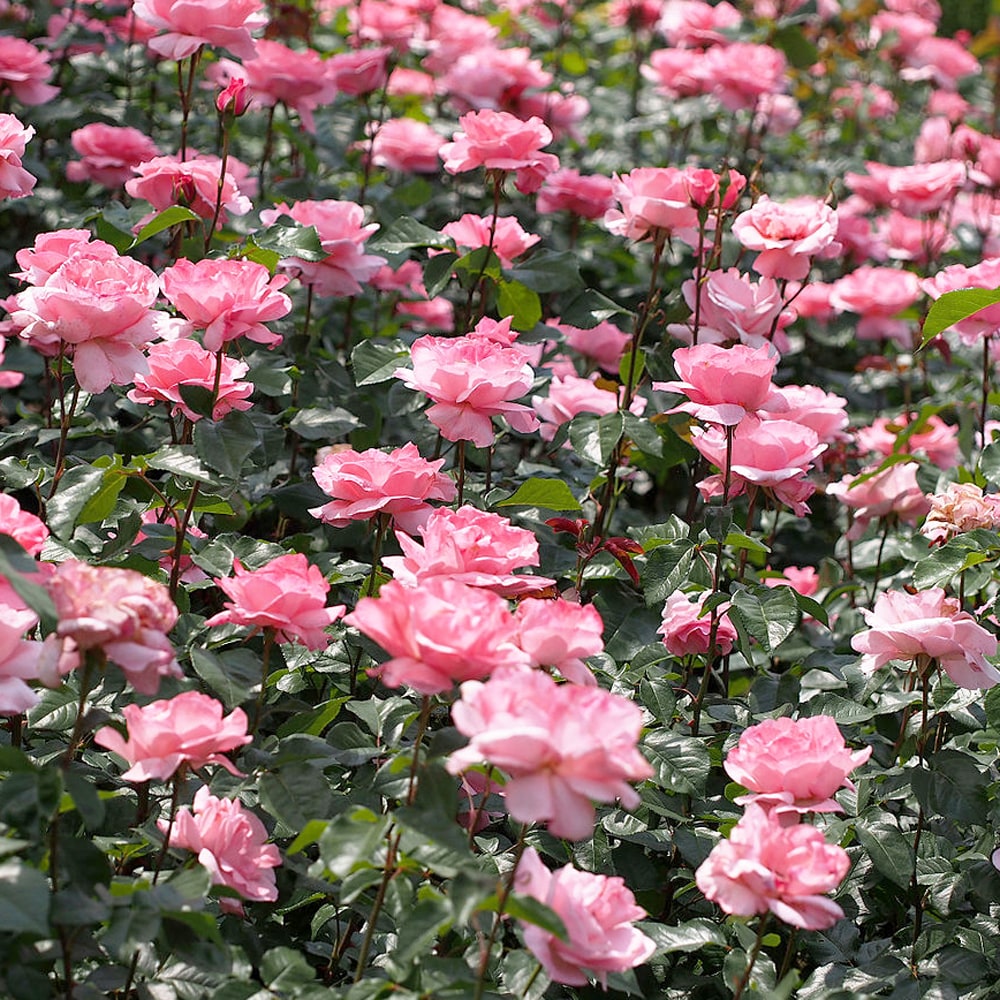 クイーンエリザベスは、1954年にアメリカで作出されたバラです。大輪の花を房咲きにつける特徴を持つバラの種類「グランディフローラ(Gr種)」の第1号品種でもあります。大らかな丸弁高芯咲きの大輪、明るいピンク色、優しいフローラル系の香りが大きな特徴です。樹勢が非常に強く枯れにくいため、強健種と呼ばれています。