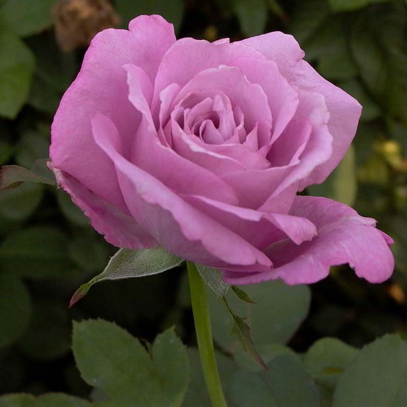 シャルル・ド・ゴールは、1974年にフランスのメイアン社が作出しました。ラベンダー色と端正な半剣弁高芯咲きの大輪花、青バラ独特の香りである強いブルー香が特徴です。樹高は1.2mと低めですが枝が太く育つため、上手に管理すれば丈夫で立派な大株に成長します。