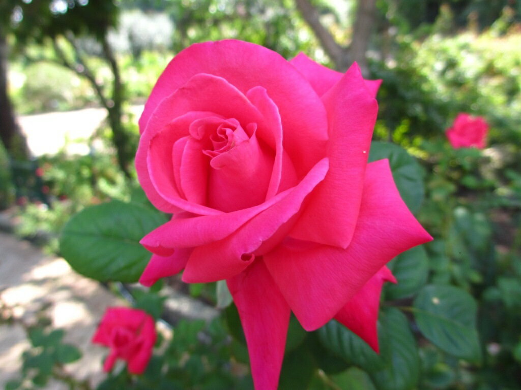 マリア・カラスは、1965年にフランスのバラ育種会社メイアン社が作出しました。花径10cm~15cmの大らかな花形に、濃いローズピンクの花色というインパクト抜群の花が特徴です。葉も大きめで、順調に育つと樹高1.2m~1.5mの大株に成長します。香りの種類はバラらしいダマスク香です。目立つ花色と華やかな雰囲気から、一株だけでも存在感があります。