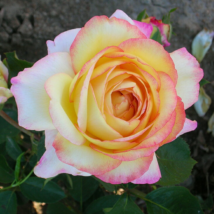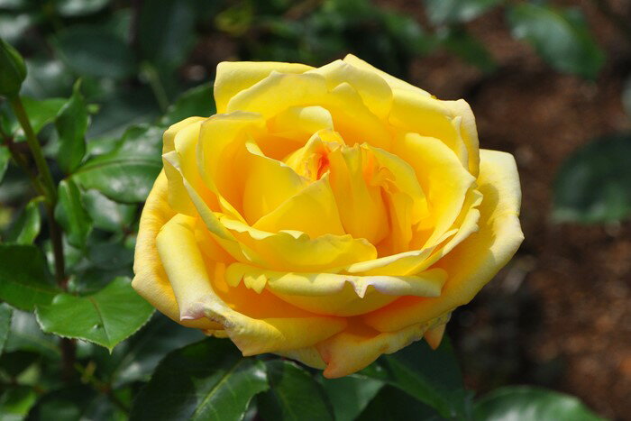かぐや姫は、1998年に日本の大手バラメーカー京成バラ園芸が作出しました。花径10cmの剣弁高芯咲きで花色は明るい黄色です。光沢のある濃緑色の葉が花色を引き立てます。このバラの大きな特徴は香りです。ティー香にフルーツ香が混ざった甘く優美な香りで、1996年度のJRC「香りの大賞」を受賞しています。
