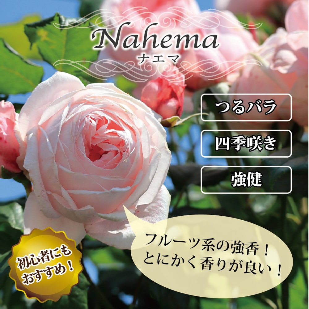 ナエマは、フランスのデルバール社が1991年に作出しました。明るく品のある淡ピンクの花色に花径8cm~12cmのカップ咲きの花形、ダマスク香にレモングラスとフルーツを混ぜた豊かな香りが特徴のつるバラです。2006年のぎふ国際ローズコンテストで、銀賞とベストフレグランス賞を受賞しています。