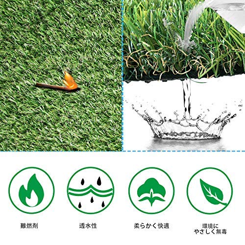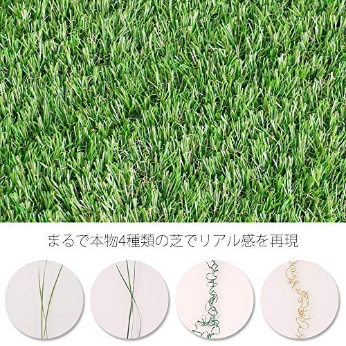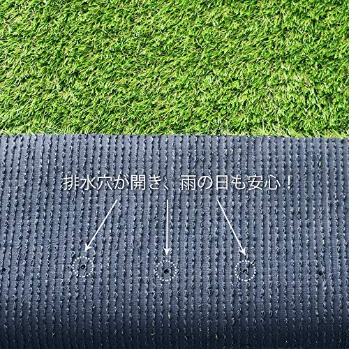 リアル人工芝は4種類の芝葉が編み込まれており、天然芝にそっくりな見た目と質感が特徴です。カーペットタイプではさみなどで簡単にカットできますよ。長さ選択(3m・4m・5m・10m)も可能です。裏地に排水穴が付いていて透水性に優れています。