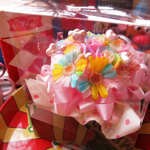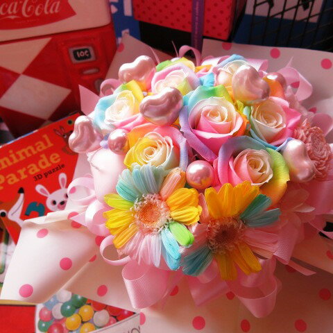 「花束風プリザーブドフラワー」は、レインボーローズとハートのオブジェがかわいらしいアレンジ風ブーケです。レインボーローズだけでなくレインボーガーベラも入っており、さらにカラフルに仕上がっています。クリアケース付きで、結婚式、誕生日、母の日、出産祝いのプレゼントなどにおすすめです。