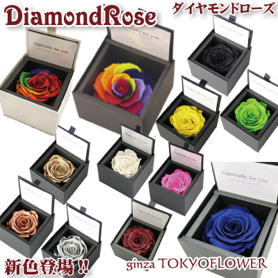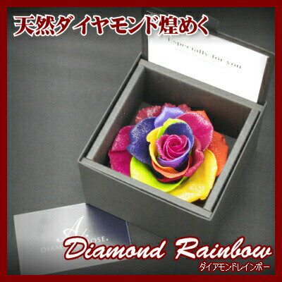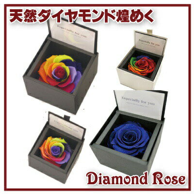 「ダイヤモンドローズ」は大輪のブリザーブドフラワーに天然ダイヤモンドをあしらった、華やかなレインボーローズです。ギフトボックスの箱を開けると虹色のバラが現れ、まるで玉手箱のようなサプライズ感もあります。結婚記念日、誕生日、ホワイトデー、母の日、還暦祝いなどに贈ってみるのもよいでしょう。
