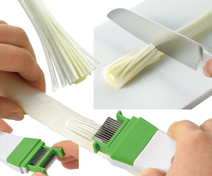 家庭用ネギカッターはさまざまな形状の商品が販売されています。ネギカッターとしてよく知られているのが、細長い刃がいくつも付いている長刃タイプです。一度に深いところまで刃が届く長刃タイプは、効率よく白髪ねぎを作りたい方が重宝するでしょう。ほかにも、万能ネギを小口切りにしたり、隠し包丁を入れたりするときも使い勝手がよいです。