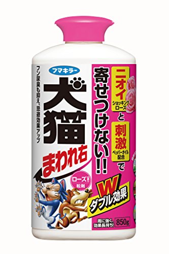 猫まわれ右は、猫が嫌うにおい成分を配合した薬剤です。犬による被害にも効果が期待できます。ローズのほかにもグリーンやシトラスの香りの製品があり、ローテーションすることで持続性が高まるでしょう。手を汚さずに、散布しやすい設計も評価されていますよ。