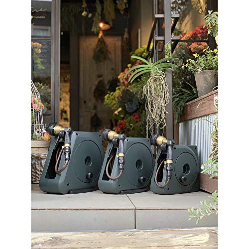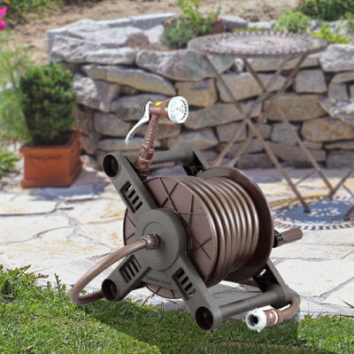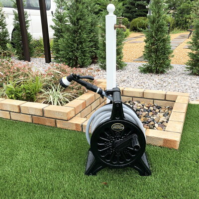 「ロイヤルガーデナーズクラブ」のホースリールは水道用ホースの人気メーカー「タカギ」が手掛けています。ほかの水道ホースとは一線を画す圧倒的におしゃれで高級感あるデザインが特徴で、ガーデニングをする人にとっては憧れのブランドともいえるでしょう。おしゃれな見た目だけではなく、使いやすさ、耐久性ともにトップクラスで、最大30mあるホースも軽々と巻き取りできます。