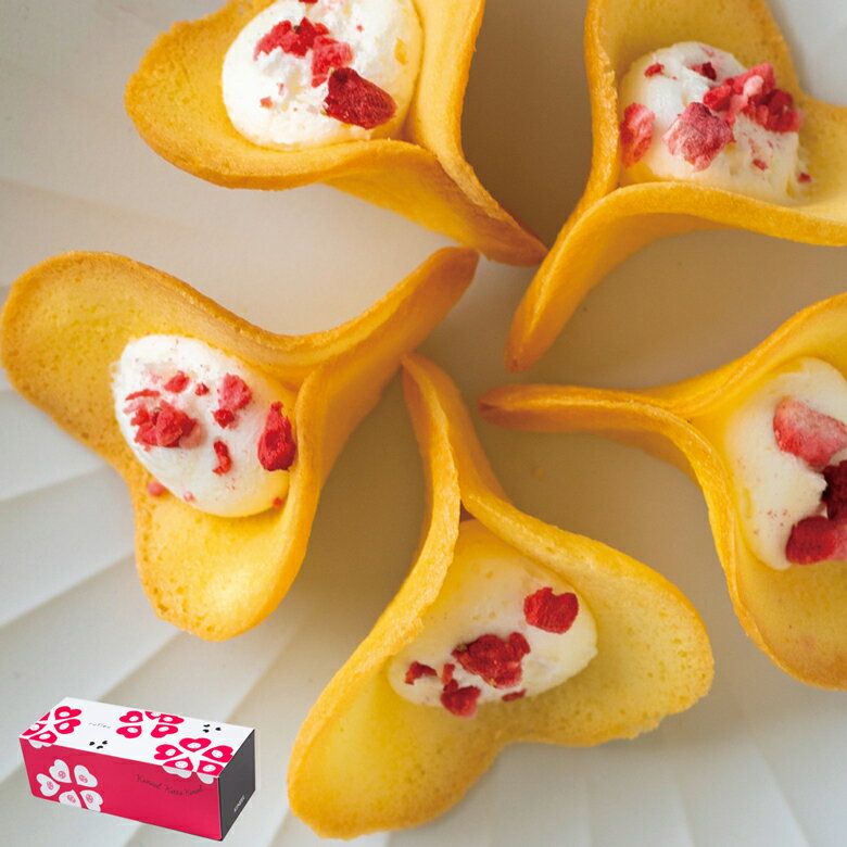 キニールのルフルは、花びらの形がおしゃれなクッキー菓子です。サクサク軽やかな食感のラングドシャに優しい甘さのクリームを詰め、フリーズドライのイチゴがトッピングされています。ラングドシャは花びらの形になるように、一つひとつ職人が丁寧に整形し焼き上げており、暖かみのある仕上がりが魅力です。