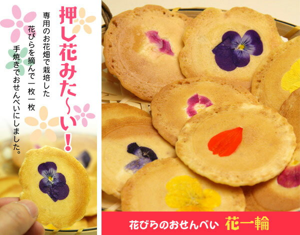 たにぐちの花一輪は、1枚に1輪の花をのせて焼いたおせんべいです。花は専用に作られた花畑で栽培され、朝摘みの花を生花のうちに押し花にして使われているため、より自然に近い発色がとてもきれいです。花の種類は季節によって変わり、注文するタイミングや時期によって違った柄を楽しめます。ほんのりとした甘さとパリッとした食感はどこか懐かしく、大人にも子供にもとても人気があります。
