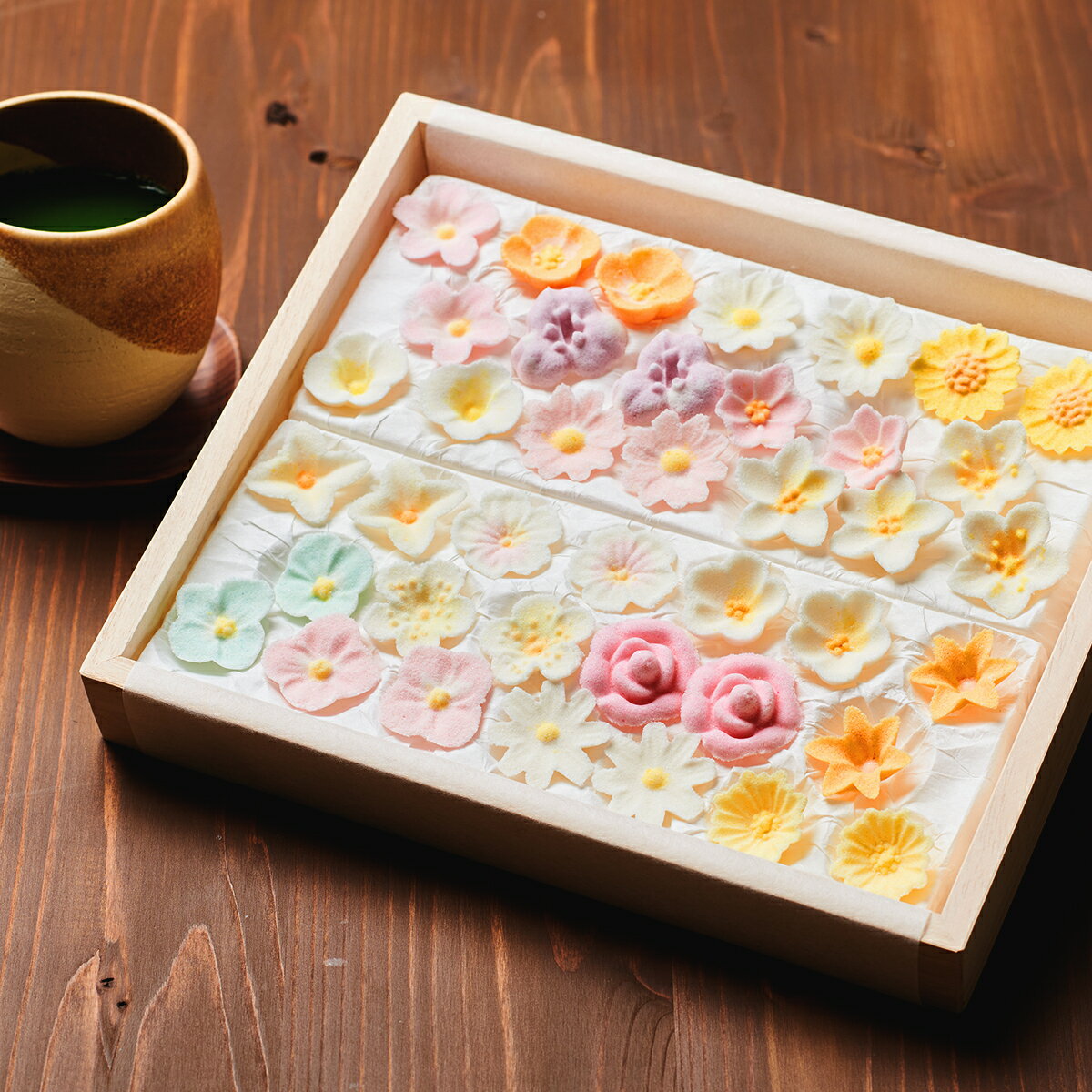和菓子悠の花舞は、小さな花の形をしたかわいらしい落雁の詰め合わせです。花のデザインは全部で20種類あり、見る人のこころを和ませます。和三盆を使用することで繊細な甘さを引き出しただけでなく、木の型の調整を幾度となく繰り返すことによって花びらの薄い形をみごとに表現しました。見た目は華やかで味わいは優しく、普段あまり落雁を口にしない方にも喜ばれる逸品です。