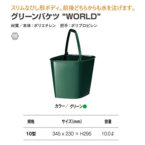 ガーデニンググリーンバケツ「WORLD」は、総合園芸メーカー「大和プラスチック」の商品です。ひし形のボディと鮮やかなグリーンカラーを特徴としています。スリムな形状で場所を取らず、前後どちらからでも水をそそげる使い勝手のよさが便利と評されるガーデニング用バケツです。内側に1L単位でメモリが刻まれているため、水の計量、肥料や薬剤の配合にも使えます。