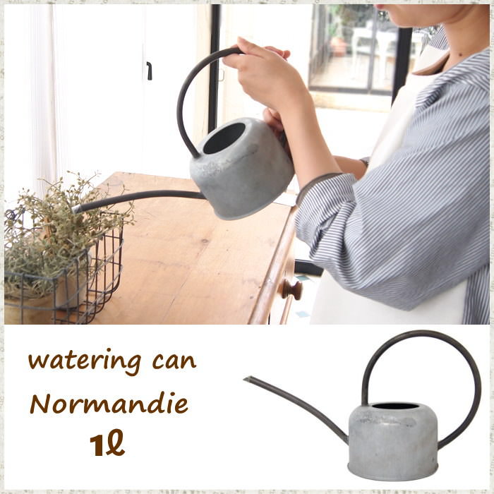 「Normandie(ノルマンディ)」の文字が刻まれた銅板プレートがついているこのじょうろは、アイアン製の取っ手とシンプルで使いやすいデザインが特徴です。おもな使用方法は鉢植えの水やりですが、インテリアとしても映えますよ。ハンドメイド商品であるため、取っ手の曲がり具合やサイズには少々個体差があります。