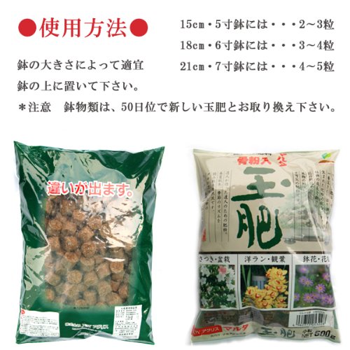 梅雨時と真夏を除く3月~10月の間に月1回、有機性の固形肥料を置きます。春は肥料が多いと新芽が伸びすぎるので控えめに、秋からは多めに与えます。