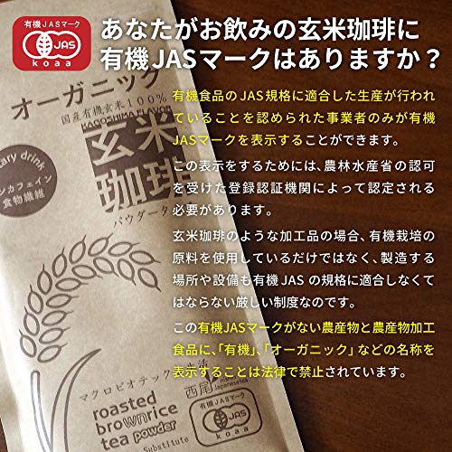 「玄米珈琲」は、鹿児島県の西尾製茶のこだわり商品です。鹿児島県産100%、完全無農薬の有機JAS認定米のみを使用しています。使用する米の鮮度にもこだわりがあり、その年に収穫された有機米だけで作られています。パウダー状の玄米コーヒーで、作り方はとても簡単です。インスタントコーヒー感覚で、手軽に飲めるのがポイントです。