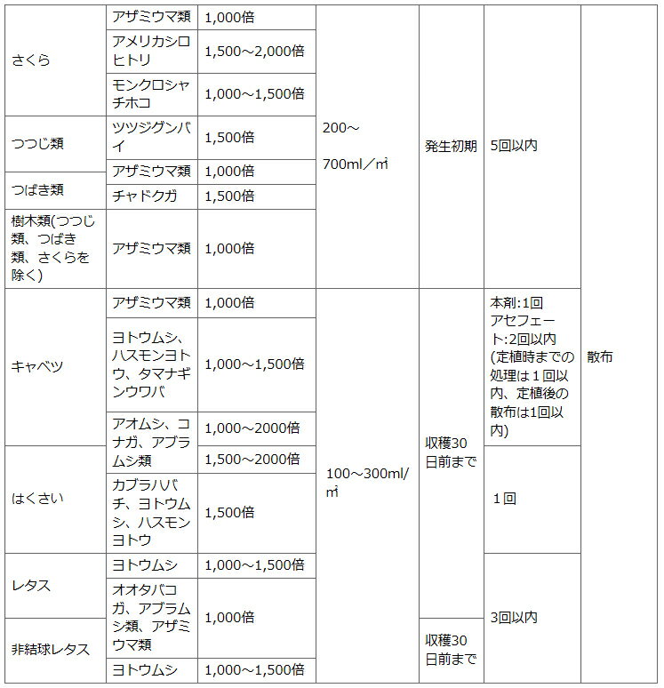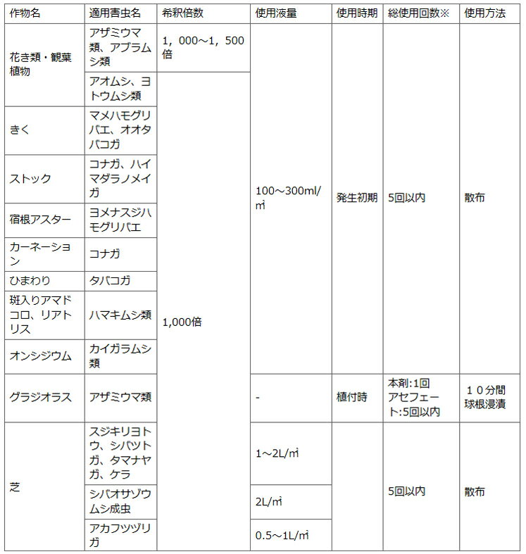 | 主な適用害虫 | アブラムシ/アメリカシロヒトリ/スリップス/カイガラムシ/毛虫/アオムシ |