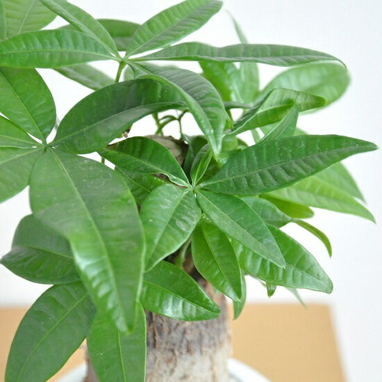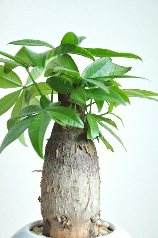 パキラは株が小さいうちは幹の色が緑色ですが、大きくなると灰緑色になります。葉っぱは掌状葉で小葉は5~9枚、艶のある楕円形です。実生株のみ10年ほど育てると白い花が咲き、実をつけ、熟すと果実が裂けて種を飛ばします。挿し木で育った株は幹が細く、種から育った実生株は幹が太くなるのが特徴です。