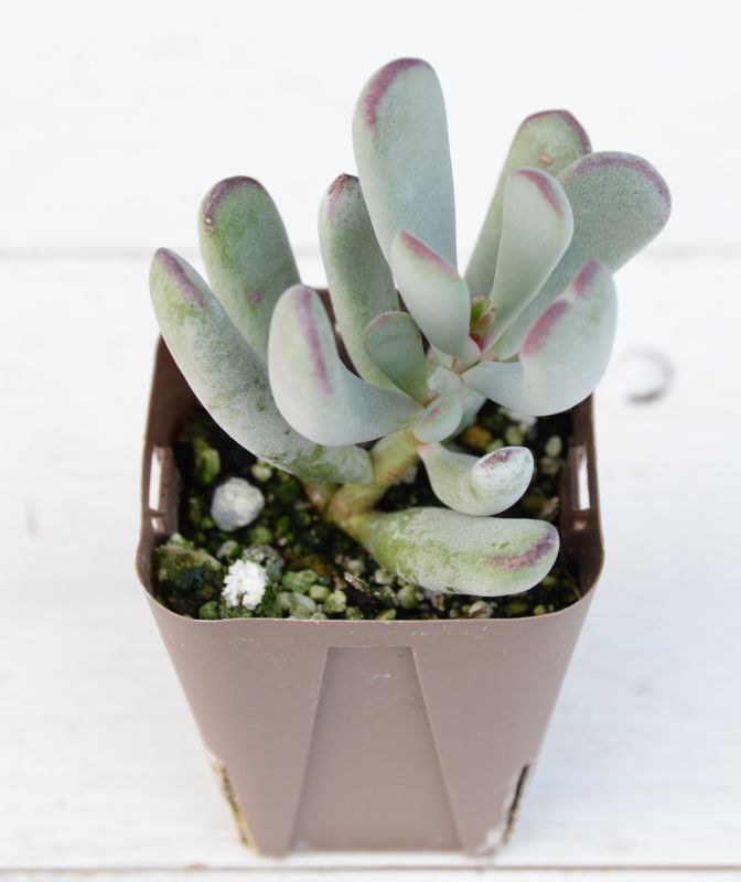 熊童子は丸くてツヤツヤした葉っぱが特徴で、熊童子の毛がない種類といったイメージです。同じ「福娘」でも大きく個体差が出やすく、葉が細身のものや丸みを帯びたもの、大葉のもの、小葉のものなどがあります。